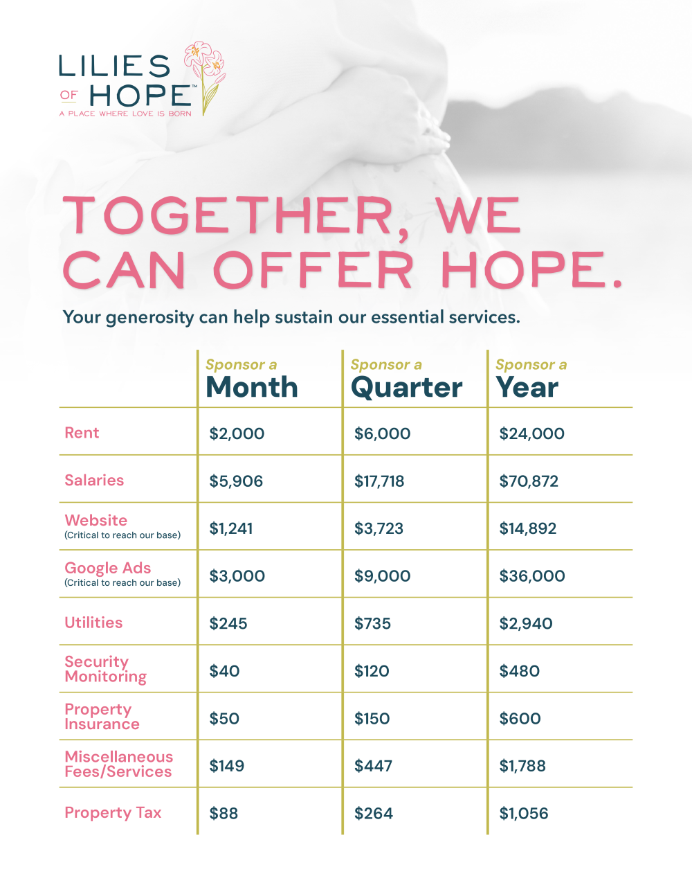 The Women’s Support Center of Milwaukee is a 501(c)(3) non-profit corporation chartered in the State of Wisconsin. Lilies of Hope WI is an affiliate of Women’s Support Center.
